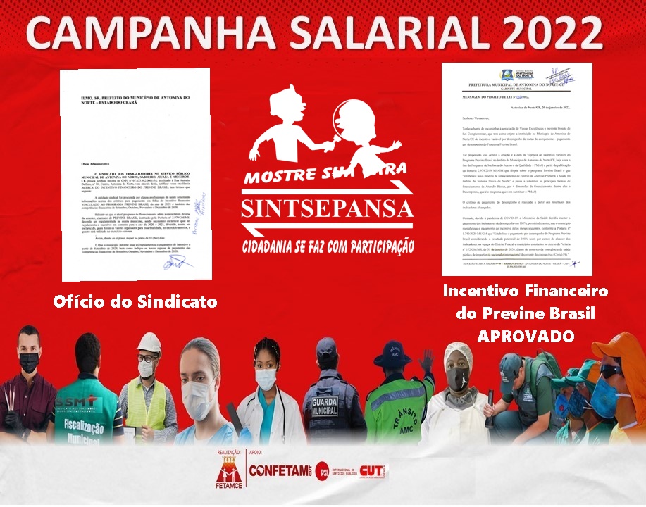 De acordo com o Presidente do Sindicato ILTEMAR MARTINS, o incentivo financeiro do previne Brasil, foi uma reivindicação do Sindicato em que foi solicitado visando contemplar os trabalhadores da Saude com o incentivo financeiro, portanto agora está devidamente regulamentado no município de Antonina do Norte através de projeto de Lei municipal nº 002/2022, de acordo com os critérios adotados considerando a lei mais atual que regulamenta a aplicação dos recursos oriundos do PREVINE BRASIL, para todos os fins de direito.