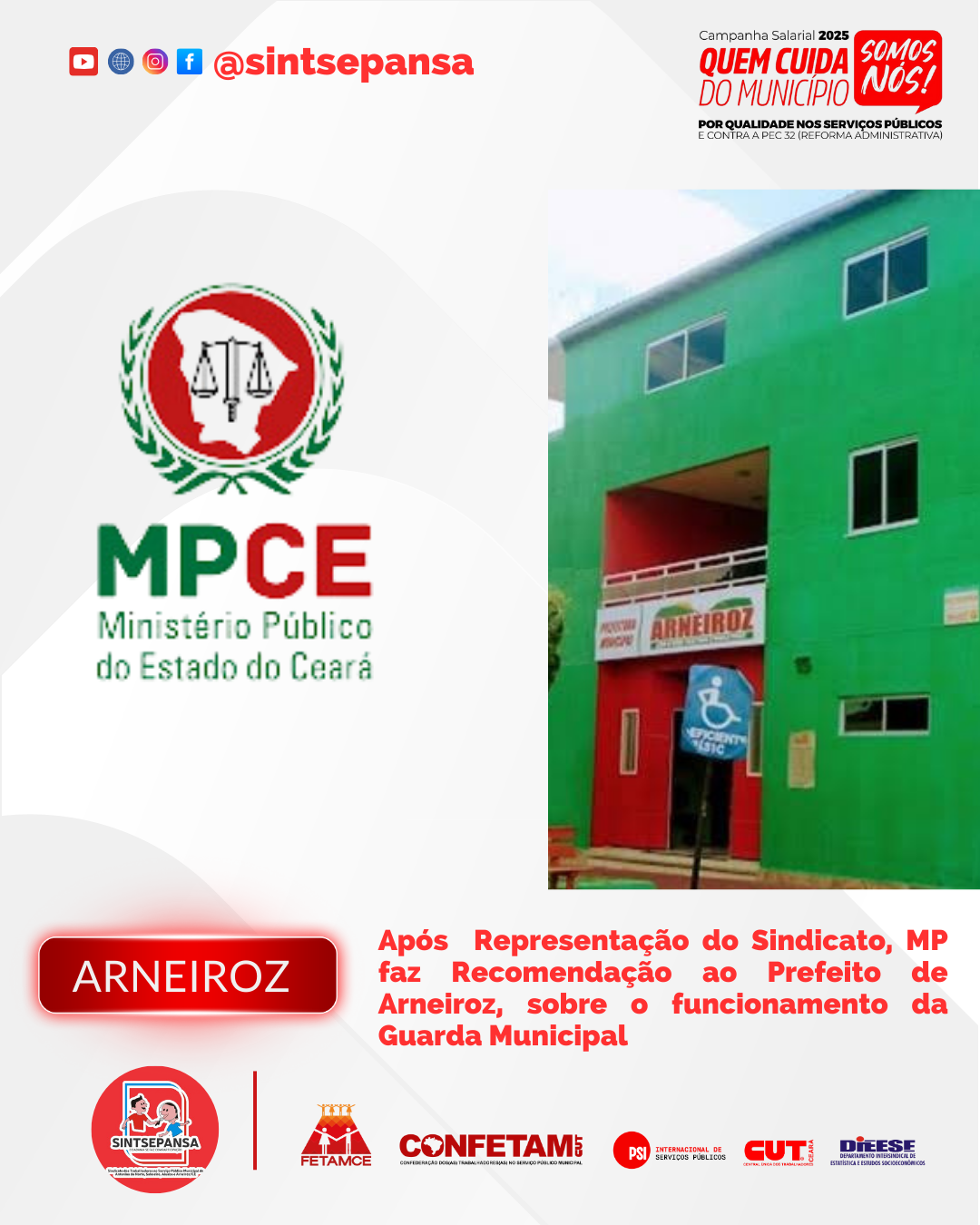 O Sindicato SINTSEPANSA, havia notificado o município de Arneiroz, em agosto de 2023, mas na época não houve manifestação por parte do município, e o Sindicato ingressou com representação no ministério público e foi aberto o Inquérito Civil Público n° 06.2024.00000944-8, para apurar a situação praticada pelo o município.