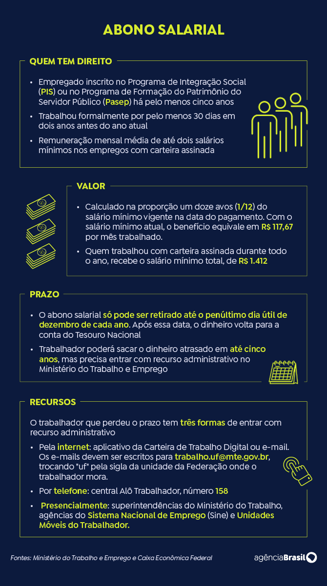 Tem direito ao benefício o trabalhador inscrito no PIS/Pasep há, pelo menos, 5 anos, e que tenha trabalhado formalmente por, no mínimo, 30 dias no ano-base considerado para a apuração, com remuneração mensal média de até dois salários mínimos. Também é necessário que os dados tenham sido informados corretamente pelo empregador na Relação Anual de Informações Sociais (Rais).