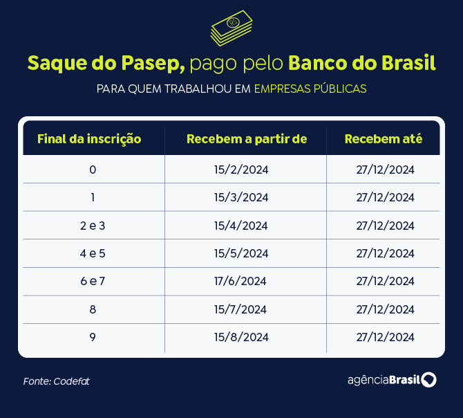 O PIS é pago pela Caixa Econômica Federal e o Pasep, pelo Banco do Brasil. Como ocorre tradicionalmente, os pagamentos serão divididos em seis lotes, baseados no mês de nascimento, no caso do PIS, e no número final de inscrição, no caso do Pasep. O saque iniciará nas datas de liberação dos lotes e acabarão em 27 de dezembro de 2024. Após esse prazo, será necessário aguardar a convocação especial do Ministério do Trabalho e Previdência.