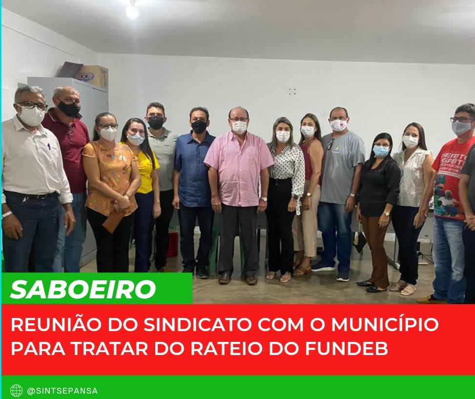 Estivemos no dia 12 de janeiro de 2022, na Secretaria de Educação do município de Saboeiro reunido com o Prefeito Marcondes Ferraz, Vice Prefeita Wylna, Secretário de Educação Junior, Secretário de Administração – Raul Sena, Secretário de Finanças – André, Assessor do Município – Aluízio, Presidenta do Conselho do Fundeb – Zeneide, Professoras – Joseli, Andreia, Ilderlange, Alinuncélia, o presidente do Sindicato – Iltemar Martins e os dirigentes sindicais Mozer Viana e Messias e o Advogado do Sindicato Dr.Frid Alves que participou de forma remota.